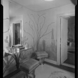 Access to this collection is generously supported by Arcadia funds. William Marien Conselman was an American screenwriter who also wrote newspaper comic strips. The William Conselman Residence was located at 4905 Lockhaven Ave. View of the entrance hall in the house of William Conselman, with desert-themed wall paper and furnished with a small table, wall mirror, and 2 stools Text from negative sleeve: Conselman. 5190. Printed.