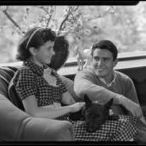 Access to this collection is generously supported by Arcadia funds. Deirdre and William J. Conselman were the children of Mina and William Marien Conselman, an American screenwriter who also wrote newspaper comic strips. Portrait photograph of Deirdre and William J. Conselman seated in their living room. Deirdre has a dog in her lap. The William Conselman Residence was located at 4905 Lockhaven Ave. Text from negative sleeve: Conselman. #19.