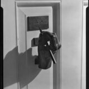 Access to this collection is generously supported by Arcadia funds. William Marien Conselman was an American screenwriter who also wrote newspaper comic strips. Door knocker on the front door of the house of William Conselman in the form of an hand holding a pen posed above a plate with William Conselman's name engraved on it. The William Conselman Residence was located at 4905 Lockhaven Ave. Text from negative sleeve: Conselman