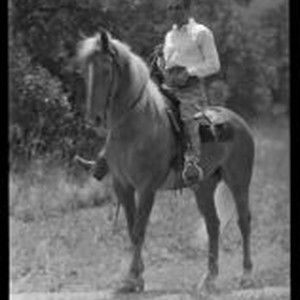 Access to this collection is generously supported by Arcadia funds. Photograph of William Conselman on horseback wearing a white shirt, jodhpurs and boots, possibly near his Eagle Rock home (4905 Lockhaven Ave.) William Marien Conselman was an American screenwriter who also wrote newspaper comic strips. Text from negative sleeve: Conselman