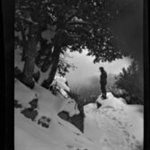 / Man smoking a pipe at a snowy lookout point, circa 1920
