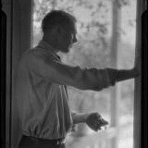 Access to this collection is generously supported by Arcadia funds. View of the upper half of an unidentified man wearing a shirt and tie and suit trousers, holding a cigarette and looking out a screen door. A porch railing and tree leaves are visible outside the door. Text from negative sleeve: Salon - Misc. portraits