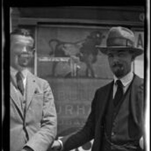 Access to this collection is generously supported by Arcadia funds. Will Connell (probably, right) wearing a hat and 3-piece suit standing in next to a man and with a Bull Durham Tobacco advertisement in the background Text from negative sleeve: Salon - Misc. portraits