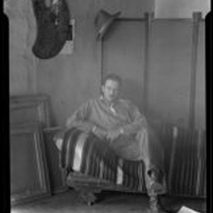 Access to this collection is generously supported by Arcadia funds. During an oral history interview in 1964, Kenneth Adams stated that he retained a house in Ranchos de Taos, near Taos (Smithsonian Archives of American Art). Kenneth Adams, Taos painter, seated in his studio on a sofa covered with an Indian blanket, with a stack of paintings leaning against the wall on the left, a pallet hanging on the wall and a cowboy hat hanging on a folding screen behind him. Kenneth Miller Adams studied with G.M. Stone in Topeka, at the Art Institute of Chicago and the Art Students League in New York, and then travelled to Italy and France for further instruction. He summered in Woodstock, NY with Andrew Dasburg, painting the landscape and developing his skills as a modernist. In 1924 Adams moved to Taos and became the last and youngest member of the Taos Society of Artists. He was also one of the most emotionally taught at the University of New Mexico, Taos. In 1938 He moved to Albuquerque during the winters, where he worked on nudes, portraits and still life, returning to Taos in the summer to focus on Indian subjects, with whom he had a close connection. He taught at the University of New Mexico in Albuquerque, as well, eventually earning a tenured professorship and a membership to the National Academy of Design.