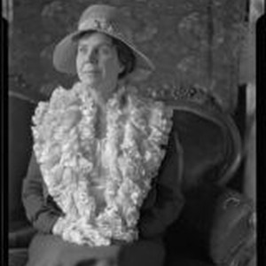 Portrait photograph of Erna Fergusson, wearing a hat and garment with a flowing, ruffled collar, seated on a Victorian style sofa with a floral fabric of wall paper in the background.