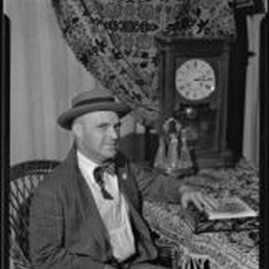 Access to this collection is generously supported by Arcadia funds. This photograph was taken on the same occasion as a portrait photograph Will Harrison, probably the Will Harrison who was an editor for the Santa Fe New Mexican, and his wife Evelyn (image ark no. 21198/zz002h2r8z). Bradford had a summer home in Santa Fe during the 1930's. Roark Whitney Wickliffe Bradford was an American short story writer and novelist. Portrait photograph of Roark Bradford seated in a wicker chair at a table covered in a floral fabric, with his hand on a book, and with a clock and patterned drape in the background.