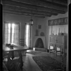 Access to this collection is generously supported by Arcadia funds. Interior view of a room in the Pueblo Revival Style home of Carlos Vierra, with a ceiling of massive wooden beams and furnished with a table, sideboard, chair and area rugs, and with a fireplace in the corner. The house is located at 1002 Old Pecos Trail, Santa Fe.