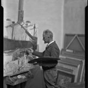 Access to this collection is generously supported by Arcadia funds. Carlos Vierra (1876 – 1937) studied at the Mark Hopkins Institute (now part of the San Francisco Art Institute) under Gottardo Piazzoni in the 1890s, and also studied illustration in New York. He was the first resident artist in New Mexico and one of the first 3 members of the Santa Fe Art Colony. He was a strong advocate for preserving landmark buildings in New Mexico and promoted a modern architectural style now called the Pueblo Revival Style architecture that reflects this historic architectural heritage. Photograph of the artist Carlos Vierra holding a palette and paint brushes as he works on a painting in his studio. Several paintings are lined up against the wall in the background. He is probably at his Santa Fe home (at 1002 Old Pecos Trail).