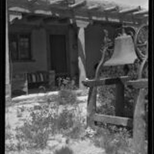 Access to this collection is generously supported by Arcadia funds. Exterior view of the house of William Penhallow Henderson and Alice Corbin with a covered porch and projecting wooden roof beams (vigas). A bell in a bell stand is in the foreground. The house is located at 555 Camino del Monte Sol. Alice Corbin Henderson was an American poet, author and poetry editor. William Penhallow Henderson was an American painter, architect and furniture designer. Text from negative sleeve: Willy and Alice Corbin Henderson
