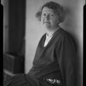 Access to this collection is generously supported by Arcadia funds. Alice Corbin Henderson was an American poet, author and poetry editor. Half-length portrait photograph of Alice Corbin Henderson seated at her home in Santa Fe, wearing a dark colored dress with a sterling silver bead necklace and conch belt. The house is located at 555 Camino del Monte Sol. Text from negative sleeve: Willy and Alice Corbin Henderson