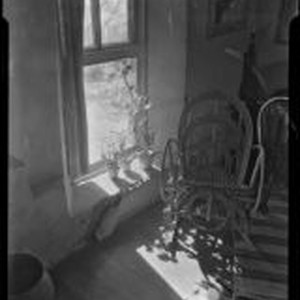 Access to this collection is generously supported by Arcadia funds. View of a room in the Sheldon Parsons Residence and art studio, located at 3 & 5 Cerro Gordo Road in Santa Fe, with a rustic bent branch rocking chair, an Indian throw rug, 2 paintings on the walls and potted plants on the window sill. Sheldon Parsons studied at the National Academy of Design and was a successful portrait artist in New York City from 1896 to 1912. He moved to Santa Fe around 1912, became a founding member of the Santa Fe colony of artists and changed from portrait painting to landscape painting.