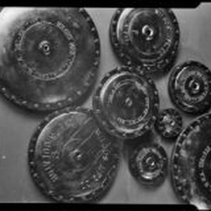 Access to this collection is generously supported by Arcadia funds. Date based on image ark no. 21198/zz002j8xf2 Photograph of nine disc-shaped gas regulator parts in varying sizes created by the Wilgus Manufacturing Company. The parts are metal-cast with embedded inscriptions identifying the company and, on some, the part number, for example: “Wilgus Mfg. Co. L. A. Cal. U.S.A. 787-987,” “Wilgus Mfg. Co. Gas Regulator.” The photograph may have been taken at the Wilgus Manufacturing plant located at 1722 East Sixteenth Street from 1921 to at least 1944. Text from negative sleeve: Wilgus Gas Gauge #14