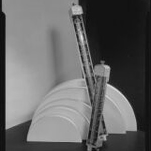 Access to this collection is generously supported by Arcadia funds. Date based on image ark no. 21198/zz002j8xf2 Photograph of 2 gas industry instruments for measuring pounds of pressure. Each thermometer-like instrument has a glass tube set within a metal case with "Natural Gas Equipment LA SF" in raised metal letters at the top, numbers from 0 to 10 on the shaft, and "Pounds" at the top of the shaft. The instruments are photographed in the corner of a dark surface with one dark wall and one light-colored wall behind and in front of 5 light-colored semicircular slabs, each larger than the one in front. Text from negative sleeve: Wilgus Gas Gauge #103