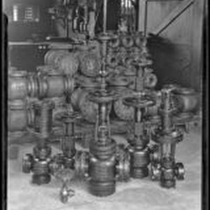Access to this collection is generously supported by Arcadia funds. Date based on image ark no. 21198/zz002j8xf2 Photograph of an assemblage of gas regulator equipment created by the Wilgus Manufacturing Company. The parts are metal-cast with embedded inscriptions identifying the company and, on some, the part number, for example: “Wilgus Mfg. Co. L. A. Cal. U.S.A. 4-inch." Behind the assemblage is a wooden platform with stacked pieces of unassembled gas regulator equipment. Chalk writing on 2 pieces is visible, reading: "Iron Thread XH," and "Steel Thread XH." The location is an industrial setting in a brick-walled room with a sliding wooden door, perhaps the Wilgus Manufacturing plant located at 1722 East Sixteenth Street from 1921 to at least 1944. Text from negative sleeve: Wilgus Gas Gauge
