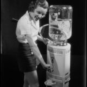 Access to this collection is generously supported by Arcadia funds. In 1917, the Arrowhead Spring Company moved its bottling plant to Los Angeles. In 1929 it merged with the company that marketed Puritas water. Advertisement photograph of a woman in tennis attire and holding a tennis racket getting a glass of water from an Arrowhead water dispenser. Text from negative sleeve: Arrowhead-Puritas