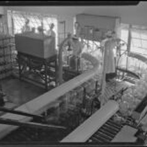 Access to this collection is generously supported by Arcadia funds. In 1917, the Arrowhead Spring Company moved its bottling plant to Los Angeles. In 1929 it merged with the company that marketed Puritas water. View of five women in an assembly line filling 5-gallon bottles of drinking water at the Arrowhead-Puritas plant. The women are dressed in light-colored uniforms and hats. Text from negative sleeve: Arrowhead-Puritas #6