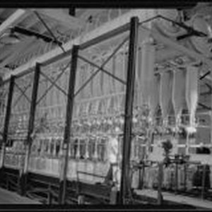 Access to this collection is generously supported by Arcadia funds. In 1917, the Arrowhead Spring Company moved its bottling plant to Los Angeles. In 1929 it merged with the company that marketed Puritas water. View of the Arrowhead-Puritas bottling plant with a row of glass 5-gallon bottles and equipment for filling them with water above. Three women dressed in light-colored uniforms and hats are just visible behind the bottles. Text from negative sleeve: Arrowhead-Puritas #6