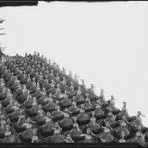 Access to this collection is generously supported by Arcadia funds. Array of soda siphon (syphon) bottles, or seltzer bottles, with nozzle tops in wooden crates, probably at the Arrowhead-Puritas bottling plant that appears in the upper left corner of the image. Connell has replaced the background with white along the right side of the image. In 1917, the Arrowhead Spring Company moved its bottling plant to Los Angeles. In 1929 it merged with the company that marketed Puritas water. Text from negative sleeve: Arrowhead -Puritas #56
