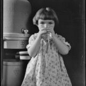 Access to this collection is generously supported by Arcadia funds. Advertisement photograph of a little girl in a floral dress drinking a glass of water, standing in front of a stoneware Arrowhead water cooler. The dispenser has the Arrowhead-shaped logo in 2 places.