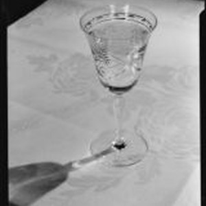 Access to this collection is generously supported by Arcadia funds. In 1917, the Arrowhead Spring Company moved its bottling plant to Los Angeles. In 1929 it merged with the company that marketed Puritas water. Advertisement photograph of a goblet of Arrowhead Spring Water on a table with a formal damask table cloth. Text from negative sleeve: Arrowhead Water