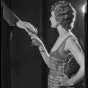 Access to this collection is generously supported by Arcadia funds. The woman appears in the same gown in a photograph for Sunkist dental (image ark no. 21198/zz002j922r) In 1917, the Arrowhead Spring Company moved its bottling plant to Los Angeles. In 1929 it merged with the company that marketed Puritas water. Advertisement photograph of a woman dressed in a gown taking a goblet of water from a the hand of a man wearing a suit jacket. Text from negative sleeve: Arrowhead Water