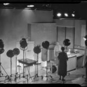 Access to this collection is generously supported by Arcadia funds. Photo shoot set-up for the "California Fruit Growers" (perhaps the California Fruit Growers Exchange). The set, illuminated by 10 lights on stands, is a kitchen with a refrigerator, stove and with a mixer and a citrus juicer on the counter. A man and a woman stand in the kitchen and another man and woman look on from the right. Text from negative sleeve: California Fruit Growers #1