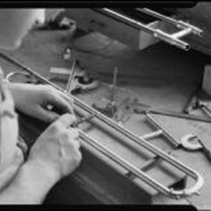 Access to this collection is generously supported by Arcadia funds. This photograph appears on page 24 of a catalog of the Chicago Musical Instrument Co. which is dated to 1933 or later (because it contains a reference to Radio City Music Hall which opened in December 1932). F. E. Olds was a manufacturer of musical instruments founded by Frank Ellsworth Olds in Los Angeles, in the early 1900s. The company made brass instruments, especially trombones, cornets, and trumpets. Olds was joined by his son Reginald Birdsall (R.B.) Olds in 1920. Their address was 1914 Raymond Ave., Los Angeles, from about 1922 to 1956. The company was purchased by Chicago Musical Instruments after World War II, and went out of business in 1979. Technician making a brass horn at the F. E. Olds and Son plant (probably a cornet, trumpet or trombone). Text from negative sleeve: Olds Instruments