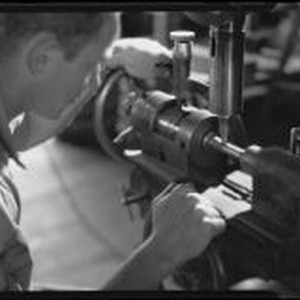 Access to this collection is generously supported by Arcadia funds. This photograph appears on page 24 of a catalog of the Chicago Musical Instrument Co. which is dated to 1933 or later (because it contains a reference to Radio City Music Hall which opened in December 1932). F. E. Olds was a manufacturer of musical instruments founded by Frank Ellsworth Olds in Los Angeles, in the early 1900s. The company made brass instruments, especially trombones, cornets, and trumpets. Olds was joined by his son Reginald Birdsall (R.B.) Olds in 1920. Their address was 1914 Raymond Ave., Los Angeles, from about 1922 to 1956. The company was purchased by Chicago Musical Instruments after World War II, and went out of business in 1979. Technician making a brass horn at the F. E. Olds and Son plant (probably a cornet, trumpet or trombone). Text from negative sleeve: Olds Instruments