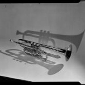 Access to this collection is generously supported by Arcadia funds. F. E. Olds was a manufacturer of musical instruments founded by Frank Ellsworth Olds in Los Angeles, in the early 1900s. The company made brass instruments, especially trombones, cornets, and trumpets. Olds was joined by his son Reginald Birdsall (R.B.) Olds in 1920. The company was purchased by Chicago Musical Instruments after World War II, and went out of business in 1979. [ Advertisement photograph of an F. E. Olds cornet with "Olds" engraved on the bell. Text from negative sleeve: Olds Instruments