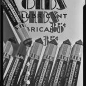 Access to this collection is generously supported by Arcadia funds. Advertisement photograph of a row of six tubes of Olds brand lubricant for trumpet valves and trombone slides against a sign reading "Olds Lubricant 35¢." Four drops of lubricant fall from a seventh suspended tube. F. E. Olds was a manufacturer of musical instruments founded by Frank Ellsworth Olds in Los Angeles, in the early 1900s. The company made brass instruments, especially trombones, cornets, and trumpets. Olds was joined by his son Reginald Birdsall (R.B.) Olds in 1920. The company was purchased by Chicago Musical Instruments after World War II, and went out of business in 1979. Text from negative sleeve: Olds Instruments