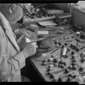Access to this collection is generously supported by Arcadia funds. This photograph appears on page 24 of a catalog of the Chicago Musical Instrument Co. which is dated to 1933 or later (because it contains a reference to Radio City Music Hall which opened in December 1932). Technician applying engraved decoration to the bell of a brass horn at the F. E. Olds and Son plant (probably a cornet, trumpet or trombone). About 50 gravers with wooden knob handles are on the work bench in front of him. The horn rests on two small stacked sand bags which are raised on a small pedestal. He wears a visor and a seersucker jacket. F. E. Olds was a manufacturer of musical instruments founded by Frank Ellsworth Olds in Los Angeles, in the early 1900s. The company made brass instruments, especially trombones, cornets, and trumpets. Olds was joined by his son Reginald Birdsall (R.B.) Olds in 1920. Their address was 1914 Raymond Ave., Los Angeles, from about 1922 to 1956. The company was purchased by Chicago Musical Instruments after World War II, and went out of business in 1979. Text from negative sleeve: Olds Instruments