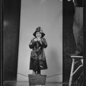 Access to this collection is generously supported by Arcadia funds. Setting the scene on a stage set for a Ghirardelli chocolate advertisement, a giggling little girl stands in a metal wash tub wearing a raincoat and rain hat as a man stands on a stool pours water on her from a watering can. Text from negative sleeve: E. W. Ghiaradelli [sic] #8