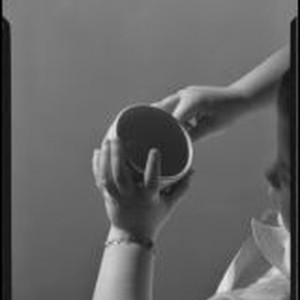 Access to this collection is generously supported by Arcadia funds. Downward view into an empty cocoa cup in the hands of a little girl during a photo shoot for Ghirardelli chocolate. Text from negative sleeve: E. W. Ghiaradelli [sic] #13 A. L. 160