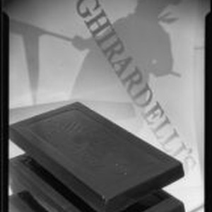 Access to this collection is generously supported by Arcadia funds. Advertisement for Ghirardelli chocolate bars. Three chocolate bars appear to float one above the other in the foreground; "Ghirardelli's" and the profile of a baker in a chef's hat and holding a baker's peel appear as shadows in the background. "Ghirardelli Since 1852" is embossed ion the top chocolate bar. Text from negative sleeve: E. W. Ghiaradelli [sic] #7