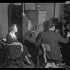 Access to this collection is generously supported by Arcadia funds. Woman seated in a rattan chair, speaking or singing, in front of sound recording equipment (?) at a sound stage or radio station. A technician has his hand on a dial. This may be related in some manner to the National Auto Shop reference on the negative sleeve. Text from negative sleeve: National Auto Shop