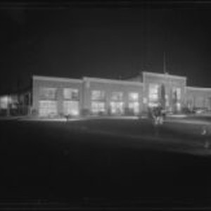 Access to this collection is generously supported by Arcadia funds. Night time view of the U.S. Electrical Manufacturing Company, identified by a sign on the front, with 3 automobiles parked in front and a sign reading "U.S. Motors" on the ground on the right. Text from negative sleeve: U. S. Motors
