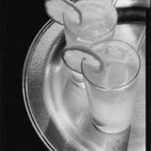 Access to this collection is generously supported by Arcadia funds. Two glasses of a beverage with lemon slice ornaments and straws, on a round metal tray. Text from negative sleeve: Sunkist. Sep 29, pie, lemons.