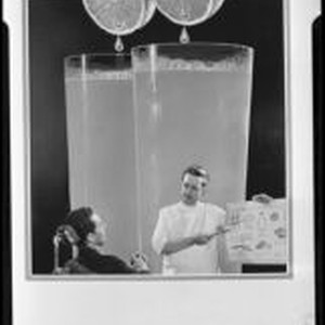 Access to this collection is generously supported by Arcadia funds. Photomontage image with a dentist showing a patient a chart displaying healthy food choices, including orange juice. Two giant glasses of orange juice are behind them. Text from negative sleeve: Sunkist dental ads