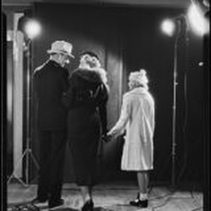 Access to this collection is generously supported by Arcadia funds. Actors dressed for cool weather and posed on a set with lighting as parents and a daughter at a photo shoot for Sunkist dental. Text from negative sleeve: Sunkist dental ads #11, A.L. 137.