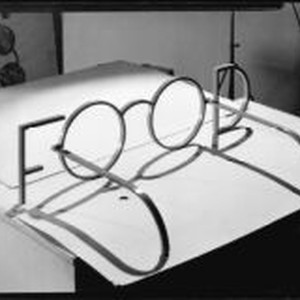Access to this collection is generously supported by Arcadia funds. "Food" in metal letters with the "OO" forming a pair of eyeglasses. The photomontage that this image was used for is visible in the background. This image was created for use in a photomontage (see image ark no. 21198/zz002j92cd). Text from negative sleeve: Portrait, Specs, Goodyear, EW.