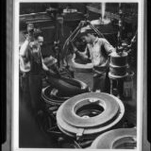 Access to this collection is generously supported by Arcadia funds. Two workers at the Goodyear Rubber Company plant, located at 6701 South Central Avenue. Text from negative sleeve: Portrait, Specs, Goodyear, E.W. #11.