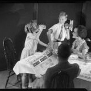 Access to this collection is generously supported by Arcadia funds. Photograph of an Adohr Farms advertisement of a family at a breakfast table with the girl drinking milk and the boy holding a bundle of books. The father holds a newspaper with the headline "School Starts Today." Text from negative sleeve: Adohr #2