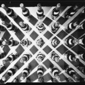 Access to this collection is generously supported by Arcadia funds. Vintage advertisements posted online for Mission Dry Sparkling beverages showing these bottle labels date to 1930 and identify the California Crushed Fruit Corporation as the manufacturer. Downward view towards bottles of Mission Dry Sparkling carbonated beverage arranged on diamonds in a grid formation.Flavors indicated on the bottle tops include lemon, orange and grapefruit. The diamonds appear to be created by cast shadows. Text from negative sleeve: Mission Dry