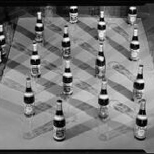 Access to this collection is generously supported by Arcadia funds. Vintage advertisements posted online for Mission Dry Sparkling beverages showing these bottle labels date to 1930 and identify the California Crushed Fruit Corporation as the manufacturer. Bottles of Mission Dry Sparkling fruit beverage and drinking glasses arranged in a grid formation with lighting designed to create a diamond pattern. Additional bottles and glasses not used for the shot are visible on the left. Text from negative sleeve: Mission Dry