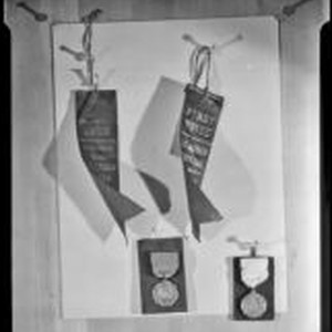 Access to this collection is generously supported by Arcadia funds. This photograph was used in 2 photomontages (see image ark nos. uclamss_893_0140 and 21198/zz002j92m1). Two ribbons and medals for prizes won by Adohr Farms dairy at the Los Angeles County Fair and a San Fernando Valley event. Text from negative sleeve: Adohr