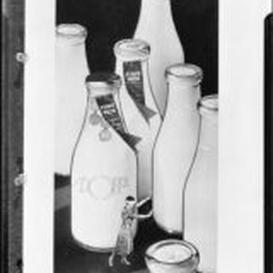 Access to this collection is generously supported by Arcadia funds. Three photographs were used to create this photomontage (see image ark nos. 21198/zz002j92kh, 21198/zz002j92xp, and 21198/zz002j92w5. Advertising photomontage with a blindfolded woman among 7 giant bottles of milk, reaching out to one bottle. There are prize ribbons from the Los Angeles County Fair and a San Fernando Valley event on 2 Adohr milk bottles.