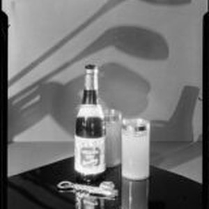 Access to this collection is generously supported by Arcadia funds. Vintage advertisements posted online for Mission Dry Sparkling beverages showing these bottle labels date to 1930 and identify the California Crushed Fruit Corporation as the manufacturer. View of a bottle of "Mission Dry Sparkling" beverage on a table beside 2 full glasses, a bottle opener and the bottle cap. The bottle label and glasses are reflected on the polished table surface and shadows of golf clubs (apparently in a golf bag) are on the wall behind.