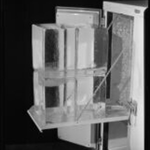Access to this collection is generously supported by Arcadia funds. Icebox with four blocks of ice on a pull-out shelf. The label on the ice box reads "Ward Cabinet[...]." Text from negative sleeve: Wessel's ice box [brand or store name]
