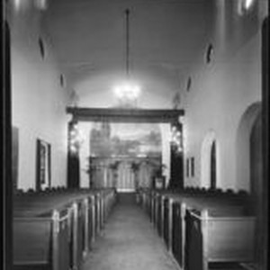Access to this collection is generously supported by Arcadia funds. View inside of the Spanish style chapel at the Pierce Brothers Mortuary, located at 720 W. Washington, with an elaborate iron chandelier and sconces, a pastoral-themed mural in the lunette and 4 potted palms. Text from negative sleeve: Pierce Bros.