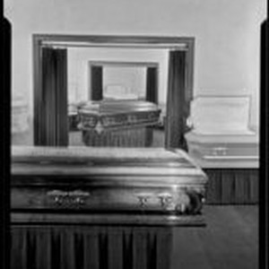 Access to this collection is generously supported by Arcadia funds. View through three adjoining room with coffins at the Pierce Brothers Mortuary, located at 720 W. Washington. Text from negative sleeve: Pierce Bros.